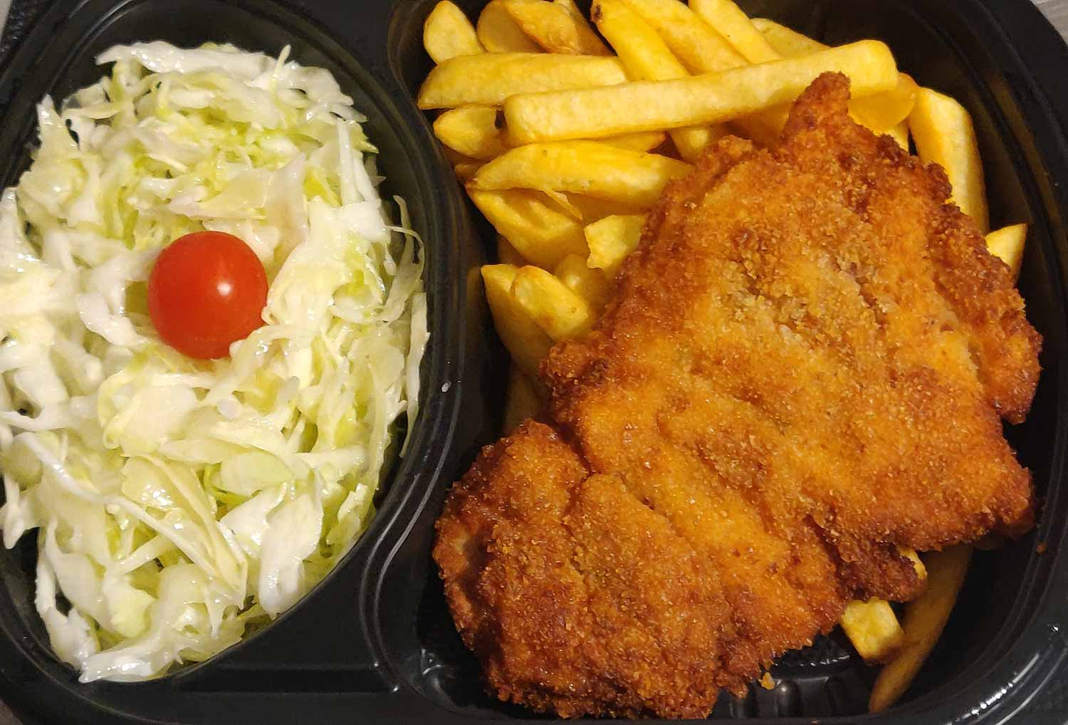 Șnițel vienez de porc tăvălit în făină, ou și pesmet, apoi „aurit” în baie de ulei, servit cu cartofi și salată.